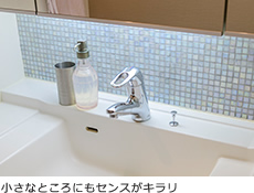 注目したいのはひときわお洒落なモザイクタイル。キッチンの演出として、光の加減で色が変わる素敵な素材をスタッフと一緒に検討。“箱買い”のモザイクタイルが余ったので、洗面化粧台に有効利用するなどたくさんのアイディアが生まれ、まるで注文住宅のように理想の家づくりが進行しました。