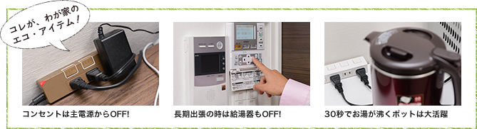 「このポットは30秒でお湯が沸きます」とご紹介いただくなど、インタビューの時間が足りなくなるほどエコへの工夫がいっぱい。環境問題のことを真剣に考えると同時に、エコライフをスマートに実践されているK様。そのスマート加減が一番真似したいところかもしれません。