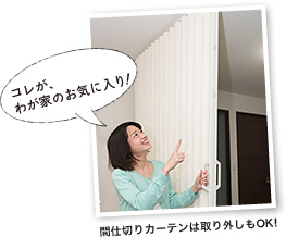 - 「例え散らかっていても、リビングに目隠しできる空間があればサッと片付けられて便利よ」というお母様の助言もあり、可動式カーテンを設計変更でオーダー。また洗面所やトイレは撥水性の高いクロスに変更され、どちらもソラーレの設計変更担当者に相談しながら選択。通勤時に通る天神でのウィンドウショッピングが大好きと言われる奥様。住まいづくりの過程もお楽しみいただいたようです。